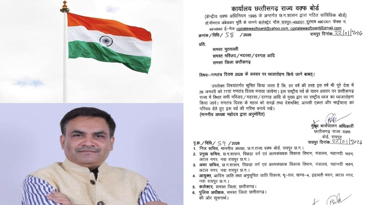 रायपुर, 22 जनवरी । छत्तीसगढ़ राज्य वक्फ बोर्ड ने यौमे जम्हूरिया (गणतंत्र दिवस) के अवसर पर राज्यभर की सभी मस्जिद, मदरसा और दरगाह में राष्ट्रीय ध्वज फहराने के निर्देश जारी किए हैं। वक्फ बोर्ड द्वारा जारी आदेश में कहा गया है कि इस वर्ष 26 जनवरी 2026 को देश में 77वां गणतंत्र दिवस मनाया जा रहा है। इस अवसर पर राज्य की सभी मस्जिद, मदरसा और दरगाह के मुख्य द्वार पर राष्ट्रीय ध्वज फहराया जाए। छत्तीसगढ़ वक्फ बोर्ड के अध्यक्ष डॉ सलीम राज ने अपील की है कि, यौमे जम्हूरिया (गणतंत्र दिवस) के महत्व को समझते हुए इस पर्व को देशभक्ति, आपसी एकता और भाईचारे के साथ मनाएं।